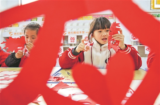 冬日,天气寒冷,江西省新余市渝水三中工会留守儿童剪纸公益课按期举行,孩子们在老师的指导下认真学习传统文化剪纸技艺。