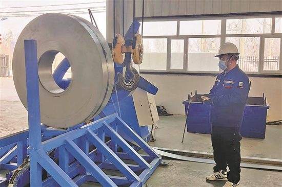 近日,在新疆中瀚顶达环保科技有限公司生产车间内,工人遥控上料机调整钢卷原来料位置。