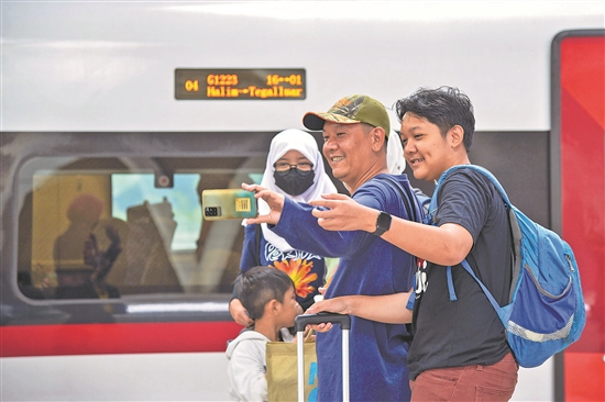 随着年末假期即将到来,印度尼西亚首都雅加达的哈利姆车站越来越热闹,很多人来这儿乘坐雅万高铁去西爪哇省首府万隆度假或返乡。截至12月24日,作为中印尼共建“一带一路”合作的“金字招牌”,雅万高铁累计发送旅客突破100万人次。图为近日,乘客在印度尼西亚雅加达的哈利姆车站站台与雅万高铁高速动车组合影。新华社记者 徐钦 摄