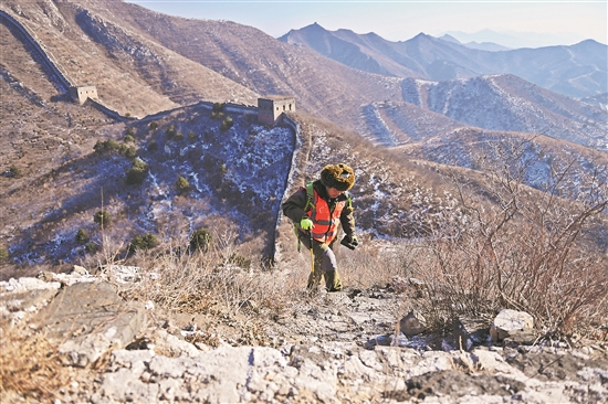 临近隆冬,河北省迁安市建昌营镇大龙庙村57岁长城保护员孟祥宝像往常一样,一大早就收拾装备,开始了巡查长城的工作。孟祥宝2016年正式成为一名长城保护员,负责守护的长城共2.5公里,其中有7座敌楼,每周要巡查四五次。