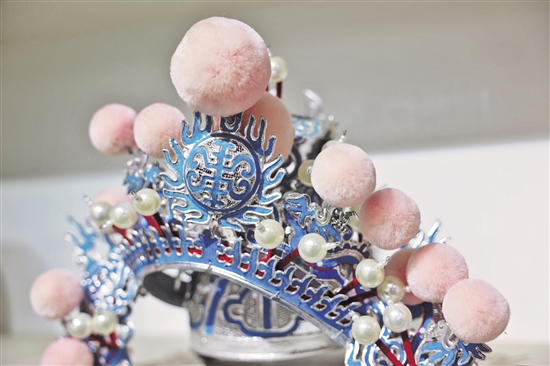 两根铁条、一根棉线、一把红丝绒,只见巧手翻飞、拨捻穿插,根根细丝反复缠绕打结,一会儿工夫,一件精致的髯口初具雏形。