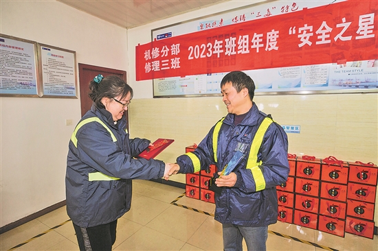 2023年12月22日,在浙江省宁波舟山港股份有限公司北仑矿石码头分公司机修分部,一场别开生面的班组“安全之星”“工时之星”表彰会在修理三班举行,以嘉奖2023年度在班组安全管理和提升工作效率等方面表现优秀的职工。图为班组“安全之星”王晟(右)领奖的场景。蒋晓东 摄