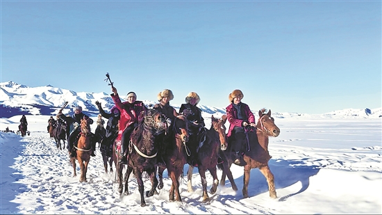 壮阔静谧的雪原上,一场别具哈萨克族风情的“刁羊”表演正在上演。20多匹骏马踏雪而来,扬起层层雪浪,引来游客阵阵惊叹。