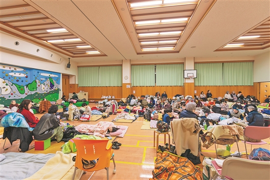 当地时间1月3日,人们在日本石川县轮岛市一处容纳超700人的临时避难所内休息。新华社记者 张笑宇 摄