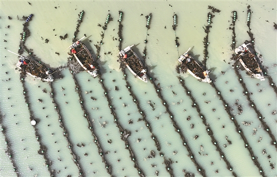 图为山东省荣成市爱伦湾海域海带养殖区内,渔民在海带采收季节劳动的场景。山东深挖海洋渔业发展潜力,累计创建国家级海洋牧场67个、约占全国40%。据初步测算,2023年前三季度,山东海洋生产总值达到1.26万亿元,同比增长6.3%。 新华社发(李信君 摄)