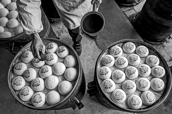 1月3日,在金华市金东区赤松镇二仙桥村,65岁的姚国宪在给蒸好的馒头盖上传统红印。
