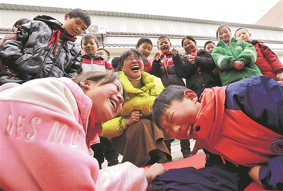 1月3日,湖北省竹山县宝丰镇红卫小学,老师正在给学生上以“直面挫折,珍爱生命”为主题的心理健康教育课,组织孩子们做掰手腕、老鹰捉小鸡等减压游戏。朱本双 摄