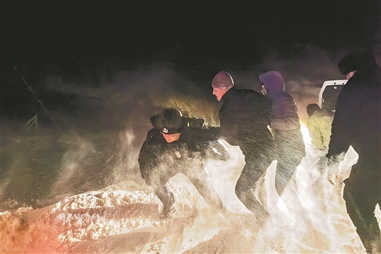 1月2日21时许, 新疆出入境边防检查总站阿勒泰边境管理支队加郎阿什边境派出所民警同群众一起,在风雪中解救被困车辆和人员。王友波 摄