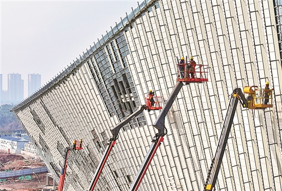 1月4日,在江西省南昌市红谷滩区的南昌保利大剧院项目建设工地,十余台曲臂车伸出“长臂”,工人们在高空中进行外幕墙安装施工。朱海鹏 摄