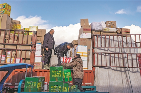 图为西藏那曲市申扎县供销合作社员工在拉萨为偏远乡镇果蔬配送试点项目的货车上货。