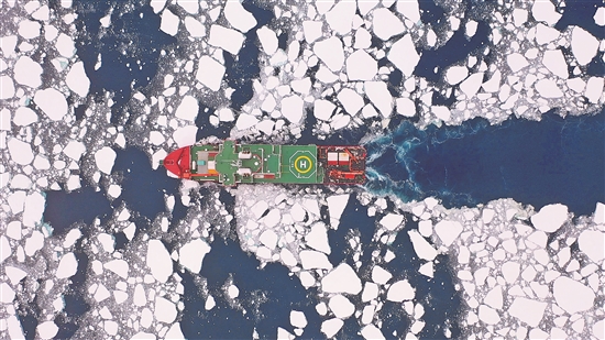 北京时间1月6日,执行中国第40次南极考察任务的“雪龙2”号在阿蒙森海为潜标布放开辟水道。