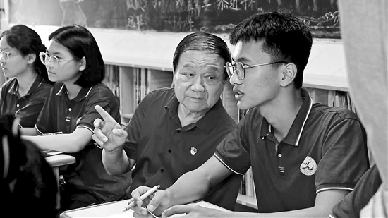 张东海(中)在万宁中学高二年级十二班的数学课上一边听课一边与学生交流。本报记者 赖书闻 摄