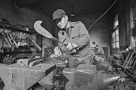 2023年12月7日,蓝炳忠在铁匠铺里打制一把镰刀。