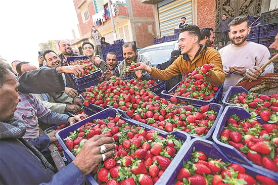 当地时间1月6日,人们在埃及盖勒尤卜省的一处市场购买新鲜草莓。当下,埃及进入草莓收获上市的季节。