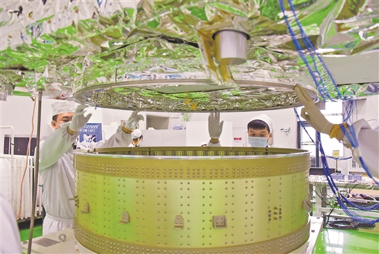 图为中国科学院微小卫星创新研究院里,科研人员在进行星箭对接试验。新华社发
