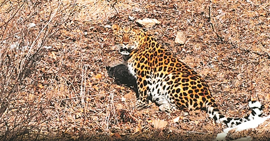 1月8日上午,在吉林省珲春市三道沟林场附近,国网珲春市供电公司两名职工在上山巡检途中偶遇一只野生东北豹。这只东北豹在路边杂草中与二人近距离对视了足足一分钟。“我来珲春工作17年了,身边很少有人能看到东北豹,我们真是太幸运了,当时也挺紧张!”目击者曹仕臣说。(本报记者 彭冰 柳姗姗 通讯员 王涛)