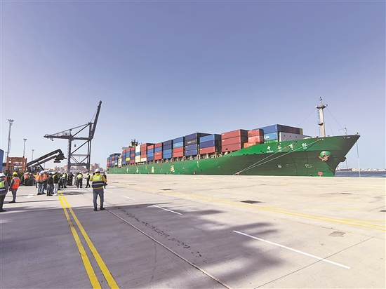 当地时间1月9日,在埃及亚历山大,阿布基尔集装箱港口码头迎来第一艘船“中谷吉林”号靠港。新华社发(徐刚 摄)