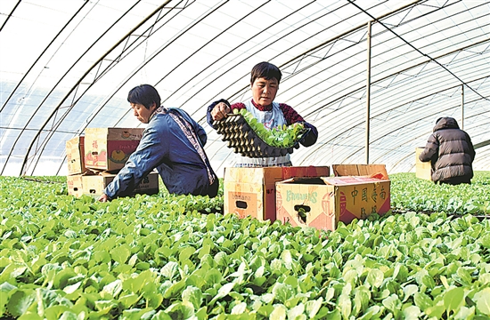 1月9日,在邢台市南和区一家育苗基地,务工农民将蔬菜秧苗装箱销售。