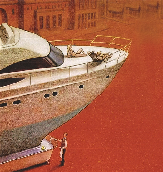 天旱河床成陆地,游艇上的人们为了过把航行“瘾”,请人在下面拼命注水,尽管船身纹丝不动,似却在水声中感受到愉悦。