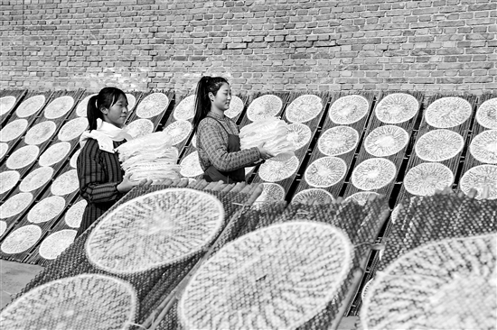 近年来,河北省邢台市广宗县按照民间传统手工工艺做法,将绿豆深加工成绿色农产品,让传统农产品增值,助力农民增收。图为广宗县刘南苏村村民在搬运加工的绿豆粉皮。新华社发(张驰 摄)