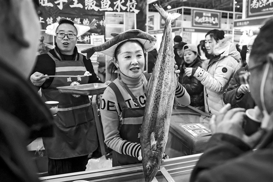 1月14日,北京,全国农业展览馆,来自山东威海的鲅鱼水饺商家正向市民介绍鲅鱼产品,同时向市民分发煮熟的水饺产品进行品尝。