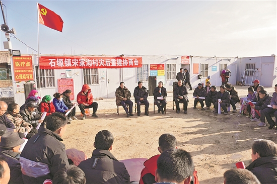 1月17日,甘肃省临夏州积石山县石塬镇宋家沟村举办了一场灾后重建协商会。协商会上,干部为群众详细介绍灾后重建的相关政策和规划;村民畅所欲言,提出灾后重建的诉求与困难。乡镇干部、村干部与村民共同商议灾后重建相关事宜。新华社记者 马希平 摄