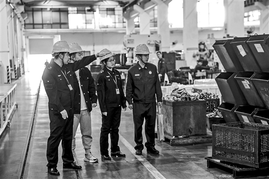 1月12日,浙江省湖州市吴兴区东林镇应急管理服务中心的执法人员在企业车间生产线排查安全生产隐患。