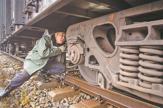 1月17日,检车员在检查车轮踏面侧架等车辆走行部。
