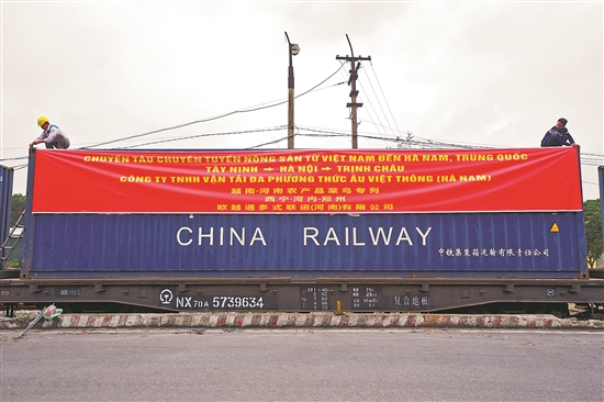 随着中越经贸合作日益加深,两国多地的铁路枢纽间形成了密集的中越班列线路。中国的郑州、南宁、重庆、成都等地,以及越南的河内、胡志明市等地,都是中越班列重要节点。中越班列开辟了中越物流运输新通道,大幅缩短了货物运输时间。图为近日在越南河内东英车站,集装箱装车结束后,两名工作人员爬至集装箱顶部悬挂注明班次信息的横幅。新华社记者 胡佳丽 摄
