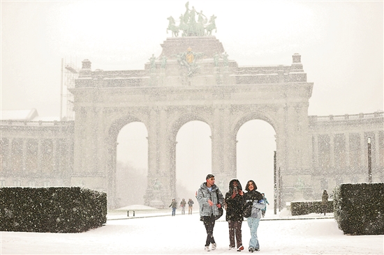近日,比利时首都布鲁塞尔迎来降雪。图为在比利时布鲁塞尔,人们冒雪在五十年宫公园游玩。