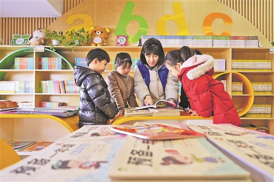 1月18日,志愿者在河北省滦州市一家城市书房内给孩子们读绘本。