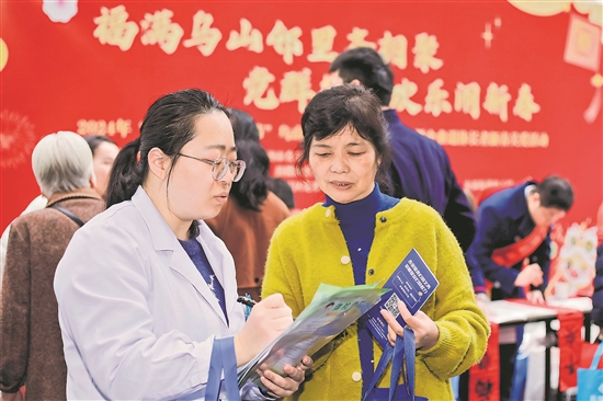 1月20日,在福建福州市鼓楼区安泰街道乌山九巷小广场,社区卫生服务中心的医护志愿者向老人宣传普及冬季养生护理知识。