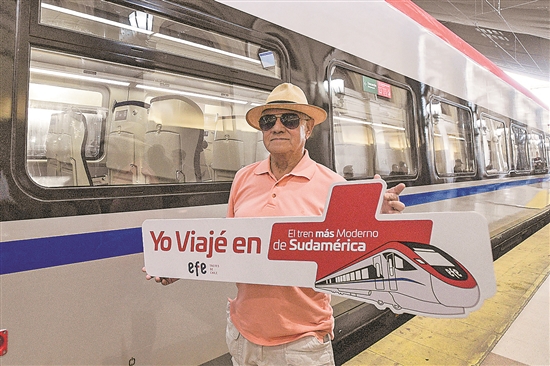近日,在智利圣地亚哥中央车站内,一名乘客举着“我乘坐了南美洲最现代列车”的标语与列车合影。新华社发 (豪尔赫·比列加斯 摄)