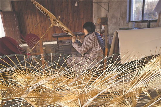 江西省婺源县赋春镇甲路村的工匠在制作甲路纸伞的伞骨。婺源甲路纸伞已有800多年的历史,2021年,甲路纸伞制作技艺入选国家级非物质文化遗产名录。目前,甲路油纸伞远销28个国家和地区。