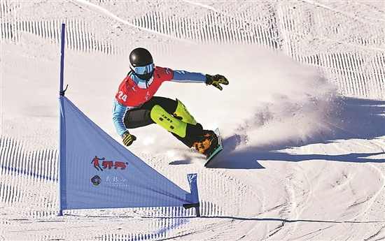 内蒙古队选手冯舒雨在“十四冬”单板滑雪青年组女子平行大回转预赛中。新华社记者 刘磊 摄