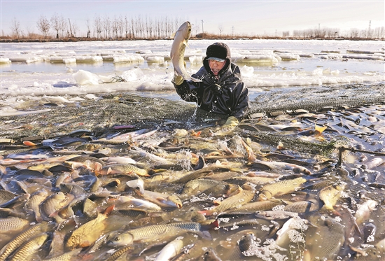 春节临近,淡水鱼养殖户破冰捕鱼,供应节日市场,丰富百姓餐桌。近年来,当地利用丰富的水资源优势,大力发展水产养殖,促进农民增收,助力乡村振兴。新华社记者 杨世尧 摄