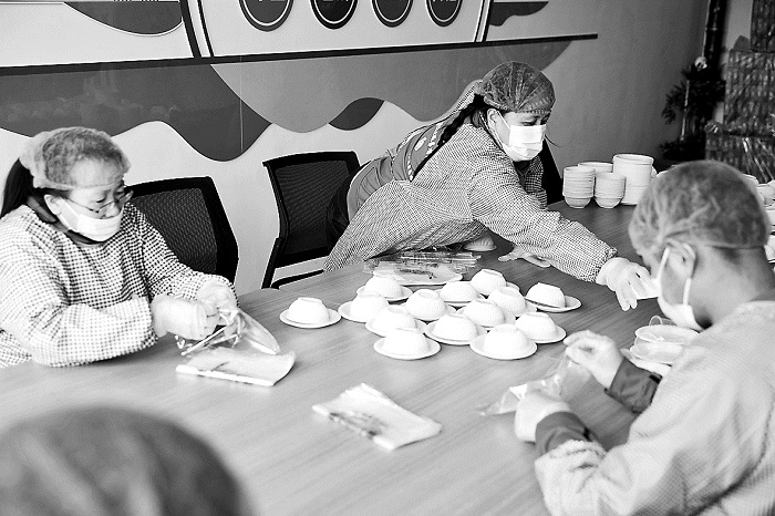 1月24日,内蒙古自治区呼和浩特市托克托县残疾人辅助就业基地,残疾人职工正在包装一次性餐具。