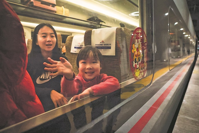 1月26日春运首日,北京西站,乘坐G6701次列车的小女孩向窗外挥手。本报记者 蔚可任 摄