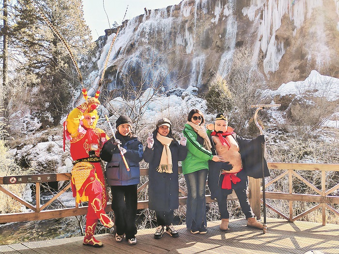 1月25日,游客在四川省九寨沟景区珍珠滩瀑布前与“悟空”“八戒”合影。珍珠滩瀑布是1986版《西游记》的取景地之一,也是九寨沟的一个标志性景点。虽然冬季是九寨沟的旅游淡季,但随着寒假到来和门票买一送一政策的刺激,每天前来九寨沟看水的游客仍然络绎不绝。本报记者 毕振山 摄