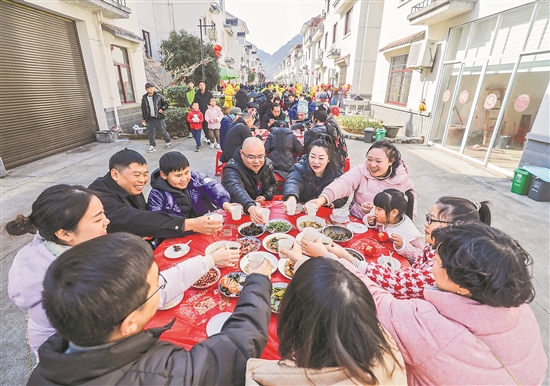 在现场举行的“越吃越有味儿”乡村百家宴上,100桌家宴在莲花镇戴家新村民宿一条街上蜿蜒展开,村民们用精心准备的特色美食款待远道而来的客人。