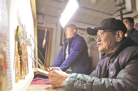 1月25日,吕正业的徒弟唐征(左后)在表演皮影戏。