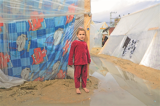 这是当地时间1月27日在加沙地带南部城市拉法的一处临时营地拍摄的巴勒斯坦儿童。受连日低温降雨的影响,拉法临时营地大量帐篷被淹,当地人道危机持续。新华社发(里泽克·阿卜杜勒贾瓦德 摄)