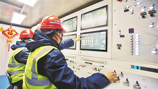 图为盾构机操作室内,操作手正驾驶“深蓝号”穿海越洋。