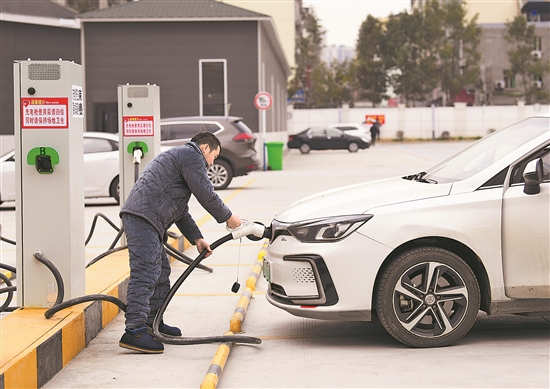 1月30日,出租车司机在江西九江火车站旁的“南铁快充”停车场为新能源出租车充电。