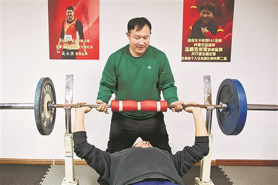 近日,在内蒙古残疾人田径训练基地内,残疾人运动员进行力量训练。本报记者 王伟伟 摄