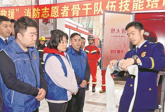 当日,长宁区消防救援支队组织辖区内由企业消防主管、居委会工作人员和社区居民组成的消防志愿者骨干队伍,开展消防技能培训活动,强化消防志愿者队伍火灾防控能力。新华社记者 方喆 摄