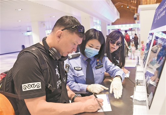 1月31日,在三亚凤凰国际机场,凤凰出入境边防检查站民警协助乘斯卡特航空公司DV473航班由阿拉木图飞抵三亚的旅客填写入境材料。