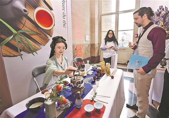 当地时间1月30日,在法国巴黎布龙尼亚宫举行的“你好!中国”旅游推介会上,嘉宾体验中国茶。由中国文化和旅游部、中国驻法国大使馆主办,中国驻法国巴黎旅游办事处承办的“你好!中国”旅游推介会30日在巴黎布龙尼亚宫举行。新华社记者 高静 摄