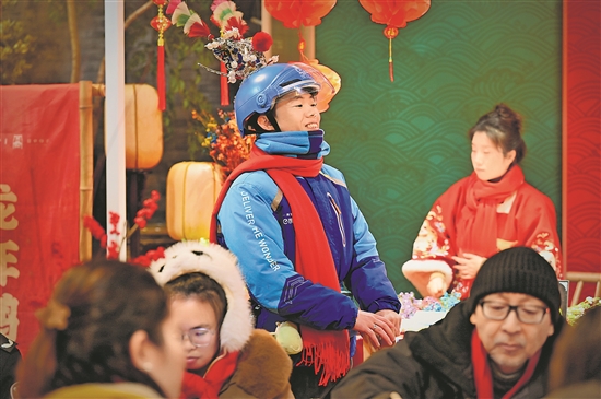 图为2月4日,外卖小哥赵明阳在活动中向大家致以新春问候。