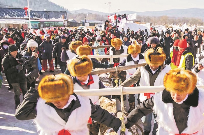 1月27日,吉林省安图县吉房子村,游客正与当地村民一起体验民俗活动,感受“森林号子”这一国家级非物质文化遗产的魅力,迎接即将到来的新春佳节。